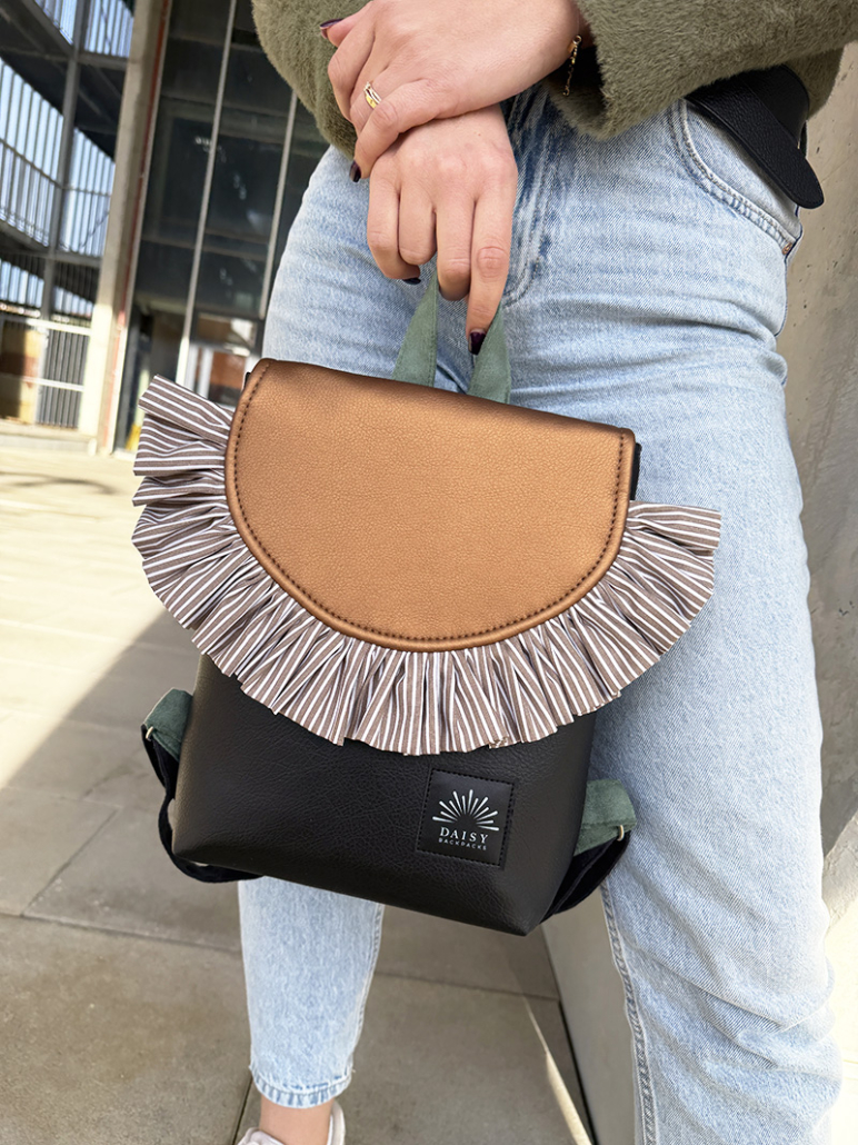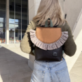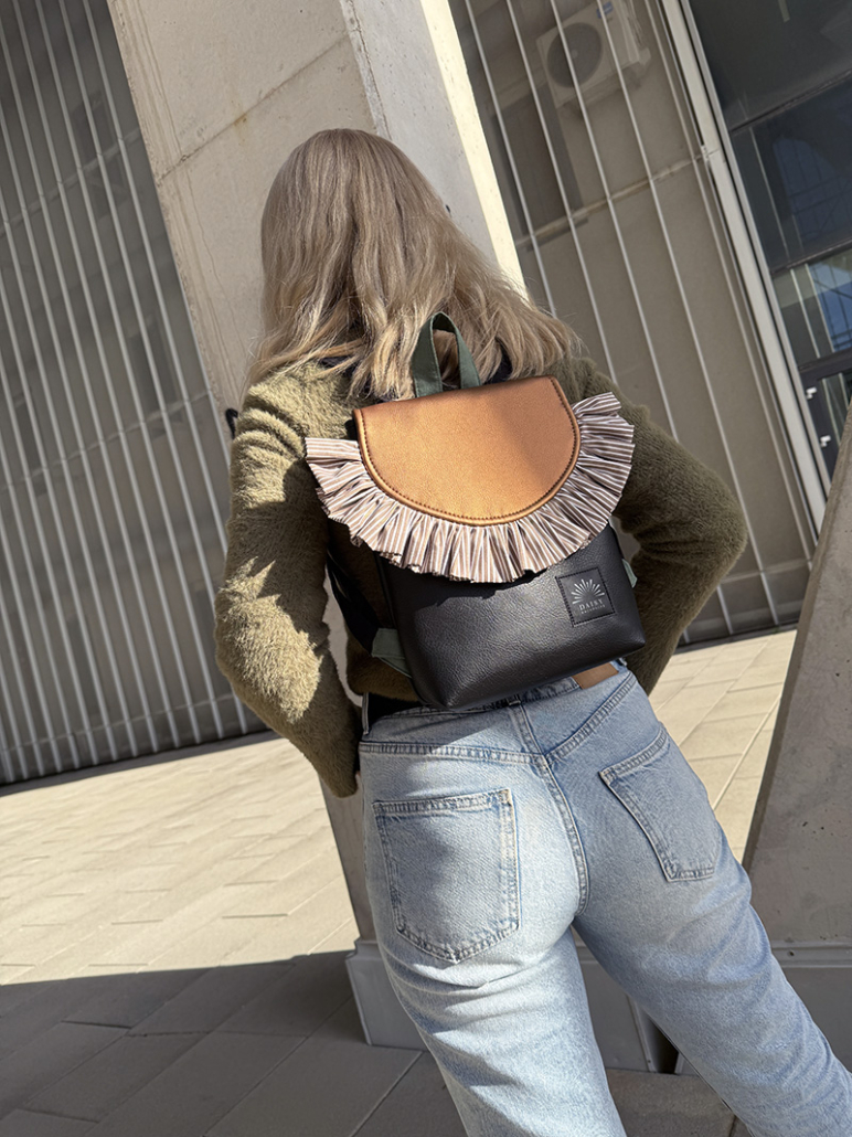 Black Ruffle backpack with shiny bronze leather and ruffles