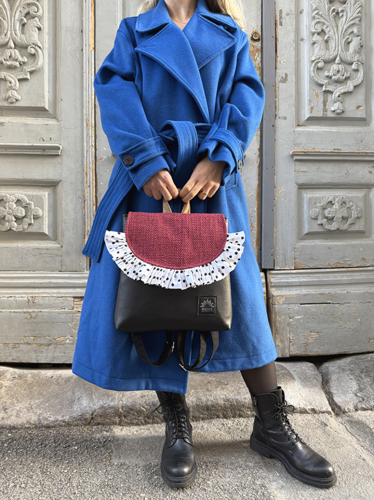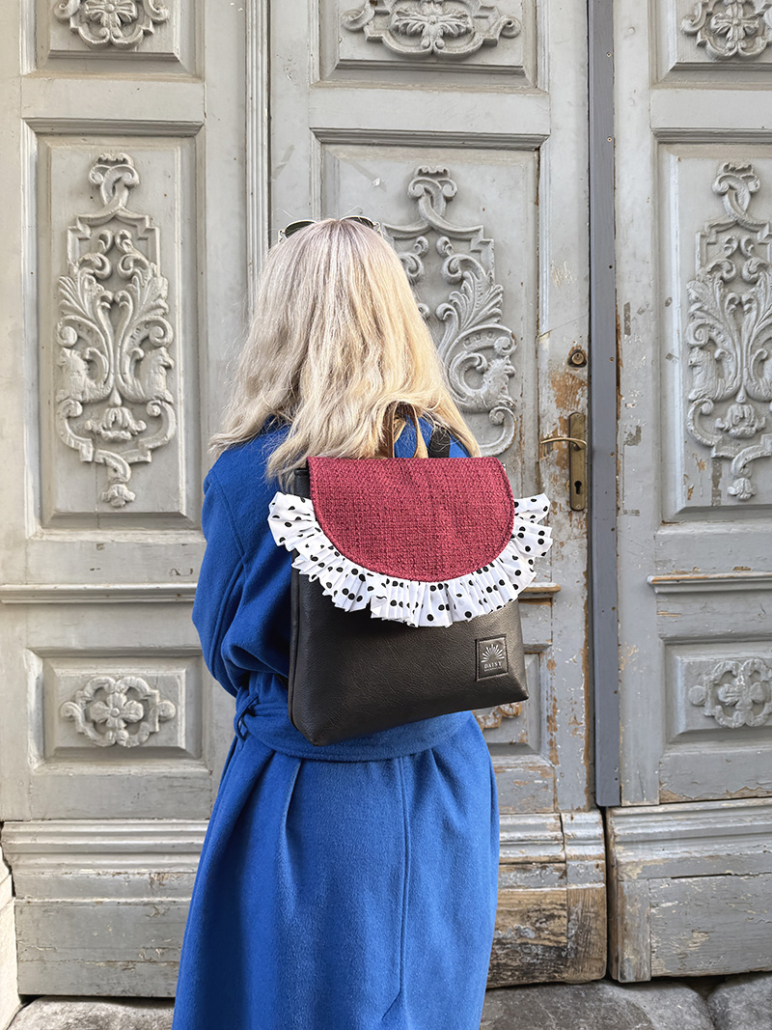 Fabric: main – eco leather, top – polyester, ruffles – cotton, lining – cotton
