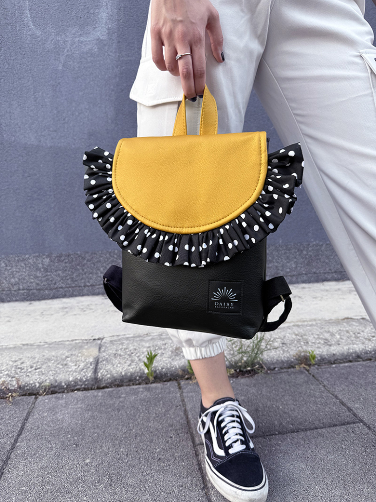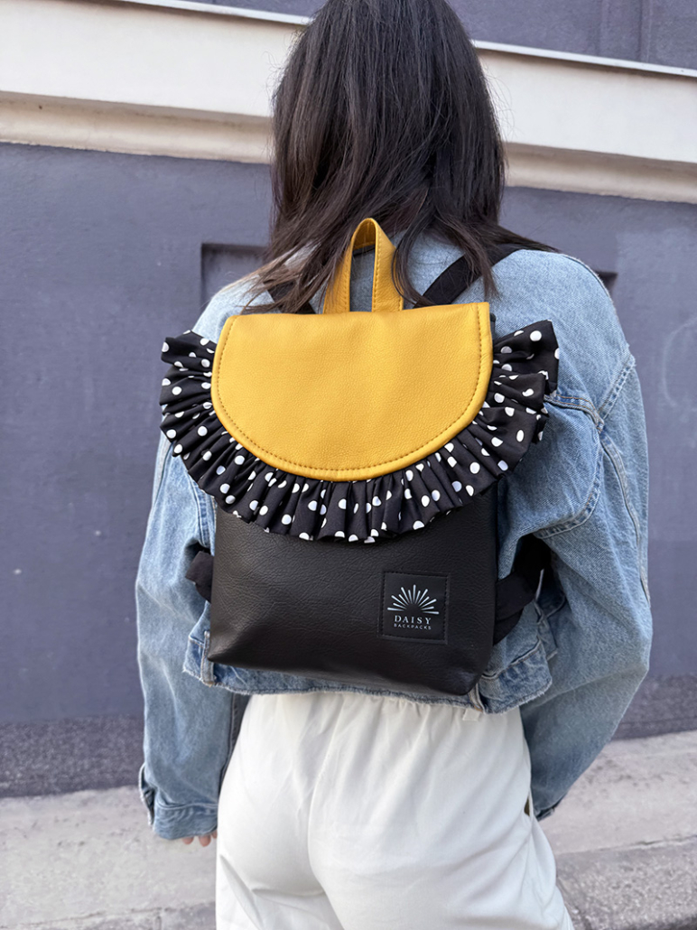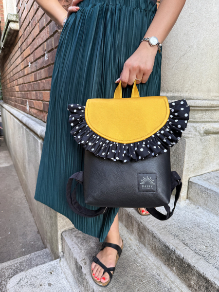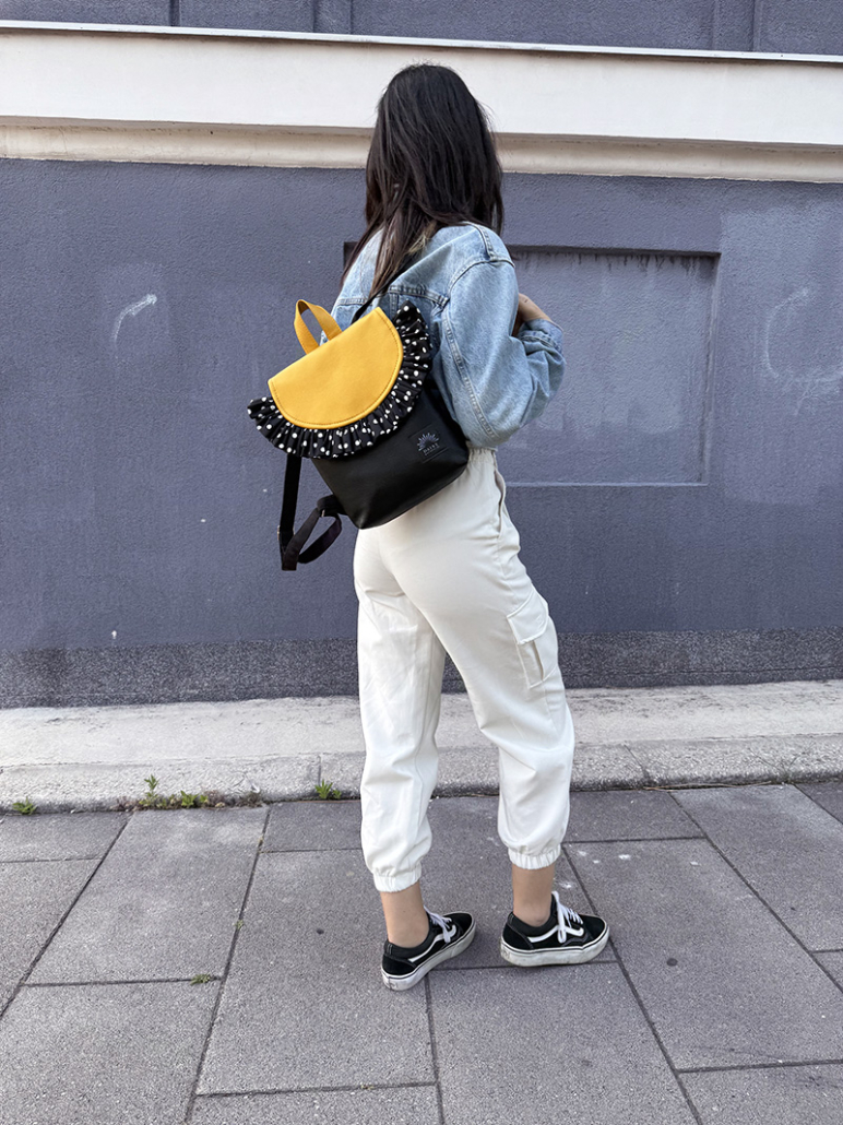 Fabric: main – eco leather, top – eco leather, ruffles – cotton, lining – cotton