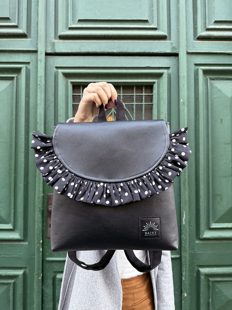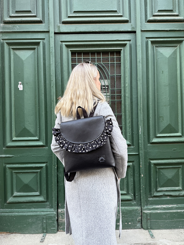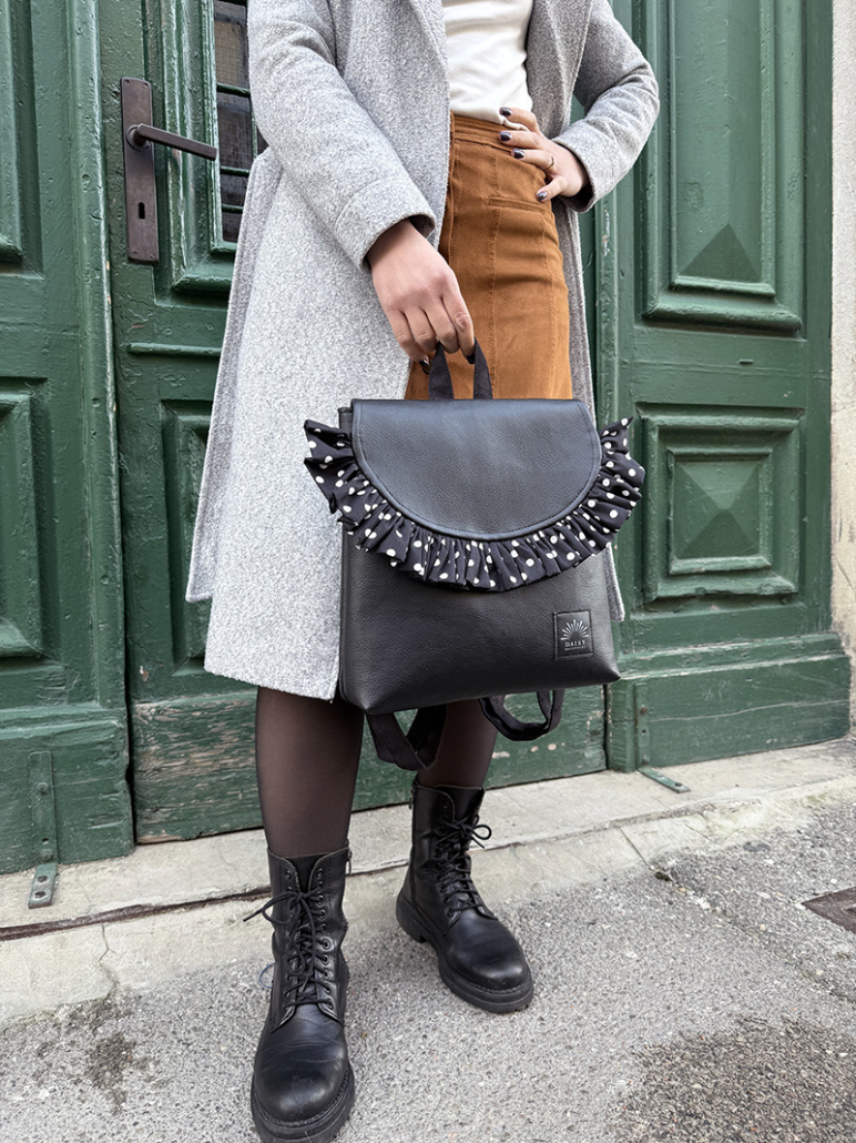 Fabric: main – eco leather, top – eco leather, ruffles – cotton, lining – cotton