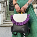 Black Ruffle backpack with white floral jacquard and purple ruffles